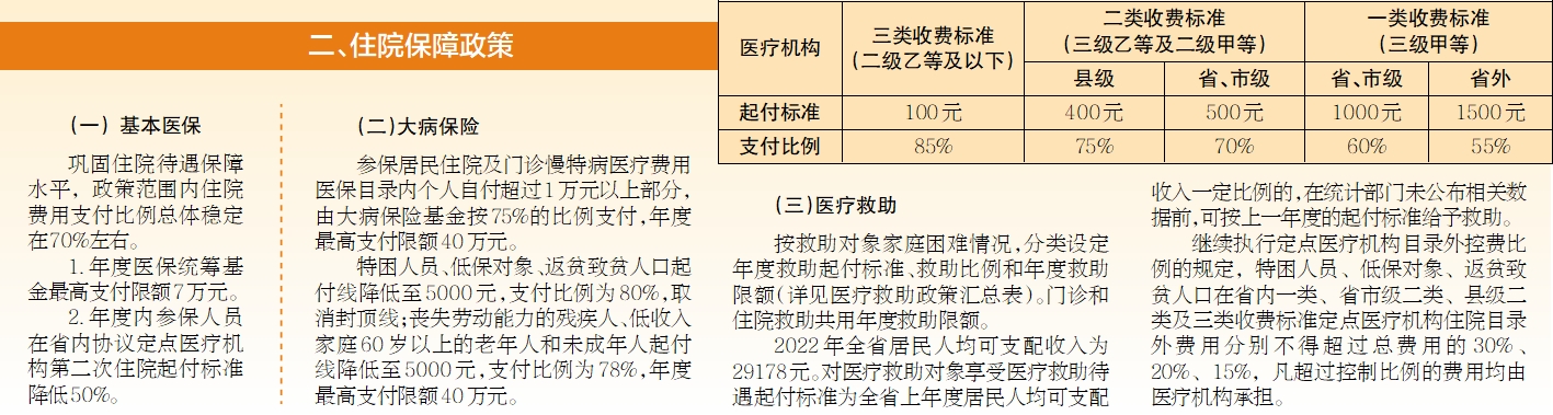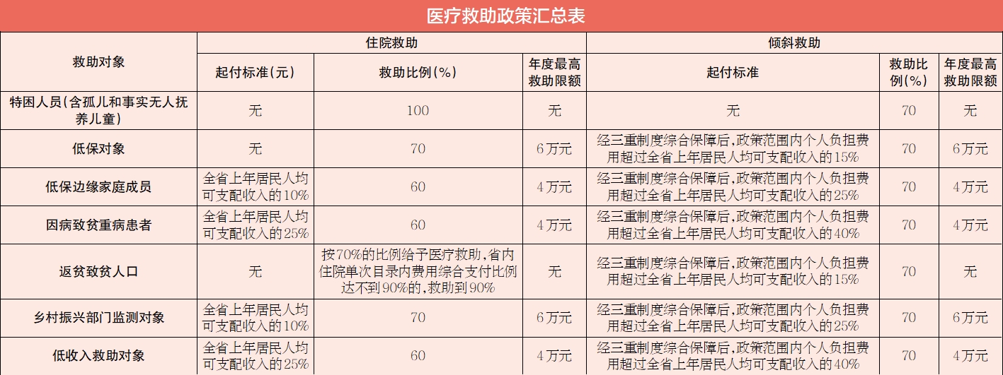 纳入全省统一的门诊慢特病病种保障范围的特困人员、低保对象和返贫致贫人口,门诊政策范围内费用经基本医保、大病保险按规定报销后,剩余部分特困人员按60%、低保对象和返贫致贫人口按30%的比例给予救助。