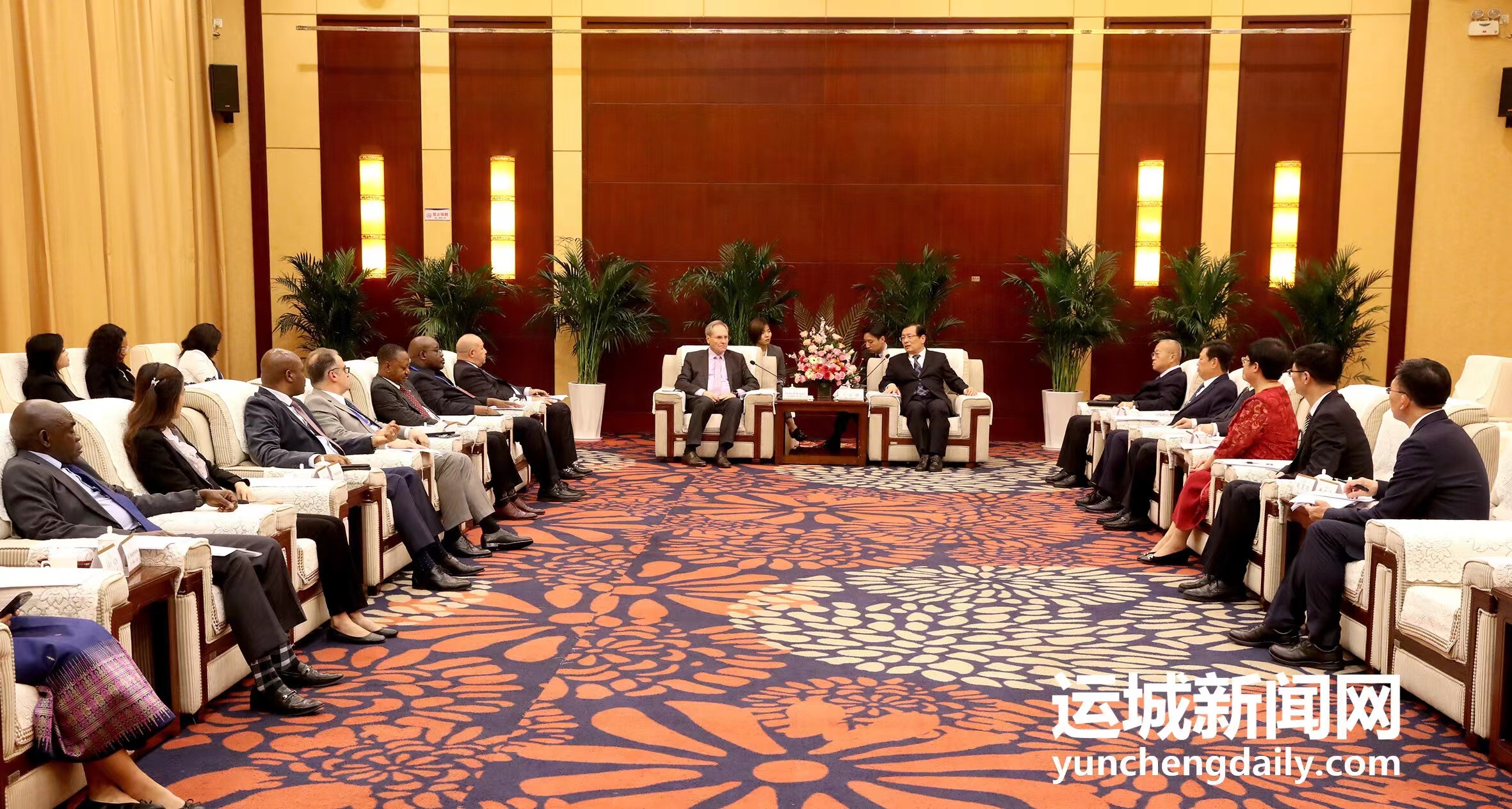 丁小强代表市委、市政府对各位外宾到来表示欢迎,对大家积极推动与运城的友好交往表示感谢。他指出,10月18日,国家主席习近平出席第三届“一带一路”国际合作高峰论坛开幕式并发表主旨演讲,宣布中国支持高质量共建“一带一路”的八项行动,为各国携手同行现代化之路、在推动构建人类命运共同体大道上阔步前进,为建设开放包容、互联互通、共同发展的世界提供了最新的中国方案。运城地处晋陕豫三省交界处,是晋南门户、关公故里、黄河中游重要腹地城市,是名副其实的农业大市。近年来,运城坚持以习近平新时代中国特色社会主义思想为指导,深入学习贯彻习近平总书记考察调研山西重要讲话重要指示精神,按照党中央及省委部署要求,加快推动高质量发展,经济社会发展实现稳中有进、稳中向好。真诚希望以此次果品交易博览会为契机,依托共建“一带一路”等重大机遇,围绕水果销售、农副产品精深加工等方面开展务实合作,强化在经贸、教育、人文、旅游等方面交流合作,在更高层次、更宽领域实现互利共赢,携手打造繁荣、稳定、和平的命运共同体。