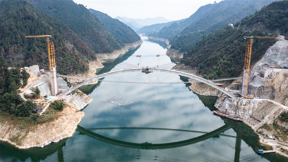 当日,由贵州路桥集团承建的锡绣大桥主拱圈顺利合龙。锡绣大桥位于贵州省黔东南苗族侗族自治州剑河县境内,是附近乡镇群众横跨清水江三板溪库区的快捷通道,桥梁建成后将极大缩短两岸往来通行时间。新华社记者 陶 亮 摄
