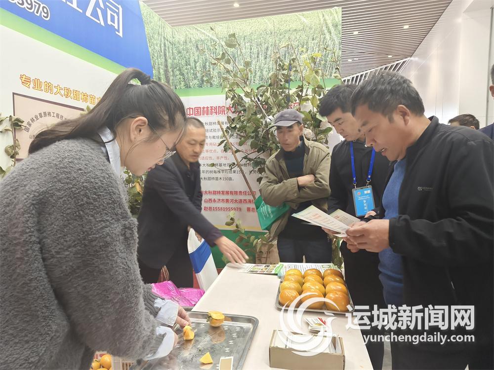 “不同品种之间是有差异的。这些品种在果实的甜度、色泽、形状上都有明显的不同。除了品种外,还需要考虑树苗的生长环境。因为柿子对土壤、水分、气温等要求比较高,所以要注意苗木生长过程中的维护和保养。”10月23日,在运城会展中心一楼的苗木展区,来自临猗县楚侯乡的果农王强(下图右一)正在听展区苗木专家讲解柿子苗木品种选择及管理知识。