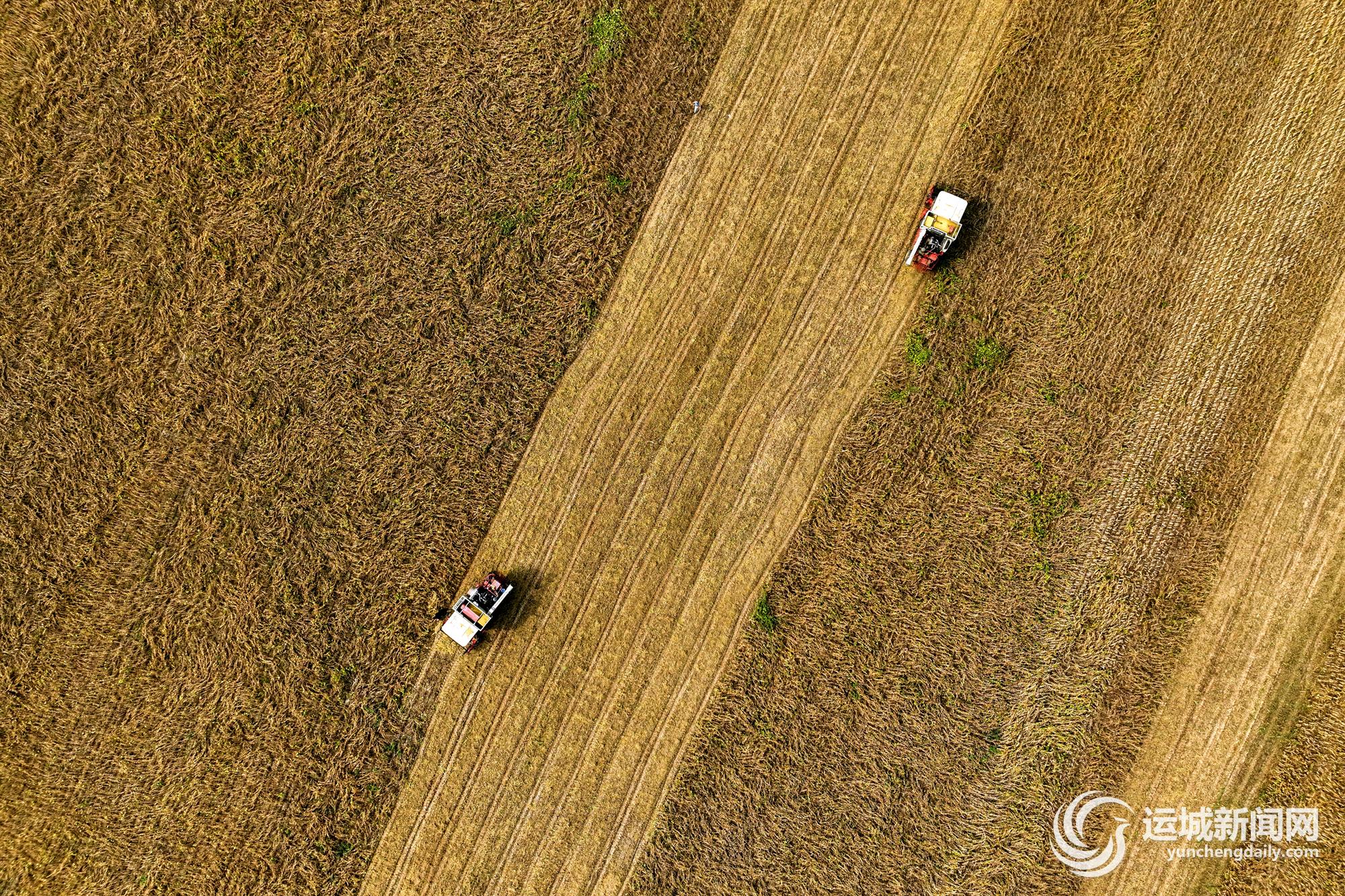 10月25日,万荣县汾河岸边黄豆种植田里,收割机来回穿梭,收割、脱粒、装运,一片繁忙景象。