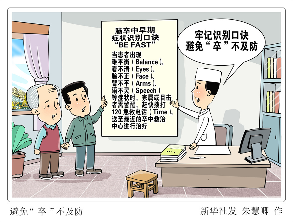 中国卒中学会会长、北京天坛医院院长王拥军说,公众应熟记脑卒中早期症状识别口诀“BE FAST”,当患者出现难平衡(Balance)、看不清(Eyes)、脸不正(Face)、臂不平(Arms)、语不灵(Speech)等症状时,家属或目击者需警醒,赶快拨打120急救电话(Time),送至最近的卒中救治中心进行治疗。“每早1分钟开始溶栓,就可以挽救患者约190万个脑细胞,其获益也就越大”。