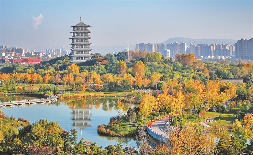 10月29日拍摄的西安世博园秋景(无人机照片)。金秋时节,西安世博园内色彩斑斓,秋景迷人。 新华社记者 刘 潇 摄