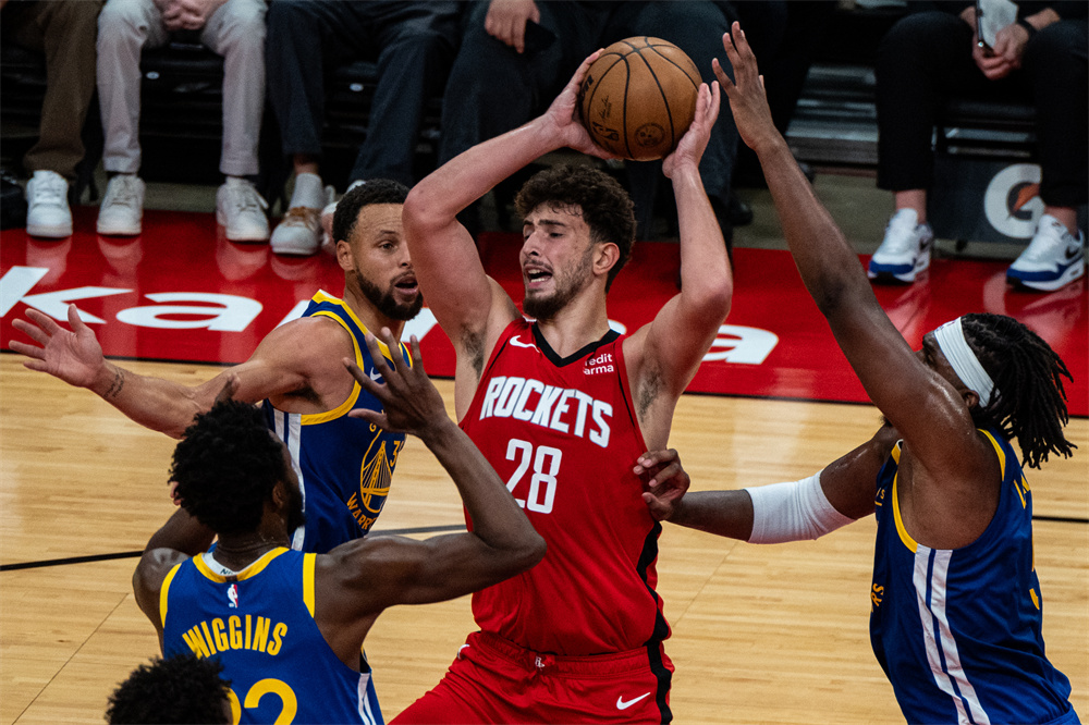 10月29日,火箭队球员阿尔佩伦·申京(中)在比赛中进攻。当日,在2023~2024赛季NBA常规赛中,金州勇士队客场以106比95战胜休斯敦火箭队。