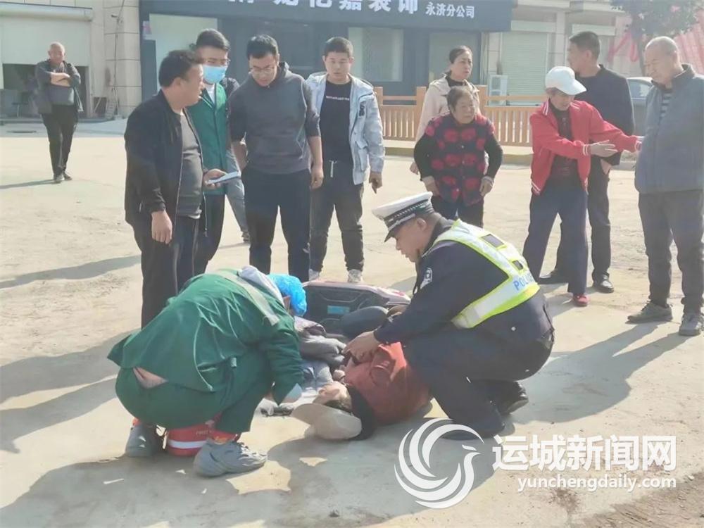 10月30日,永济市区道路发生一起致人受伤交通事故。当天10时40分,永济交警大队城市中队魏阳、孟江等人在辖区巡逻中,发现一起轿车与电动自行车碰撞、致电动自行车驾驶人受伤的交通事故。危急时刻,民辅警一边安抚伤者情绪一边联系伤者家属,并拨打120急救电话;在急救车赶到后,民辅警又积极协助急救人员将伤者抬上救护车,并为急救车开辟绿色通道,让伤者在最短时间内得到有效救治。