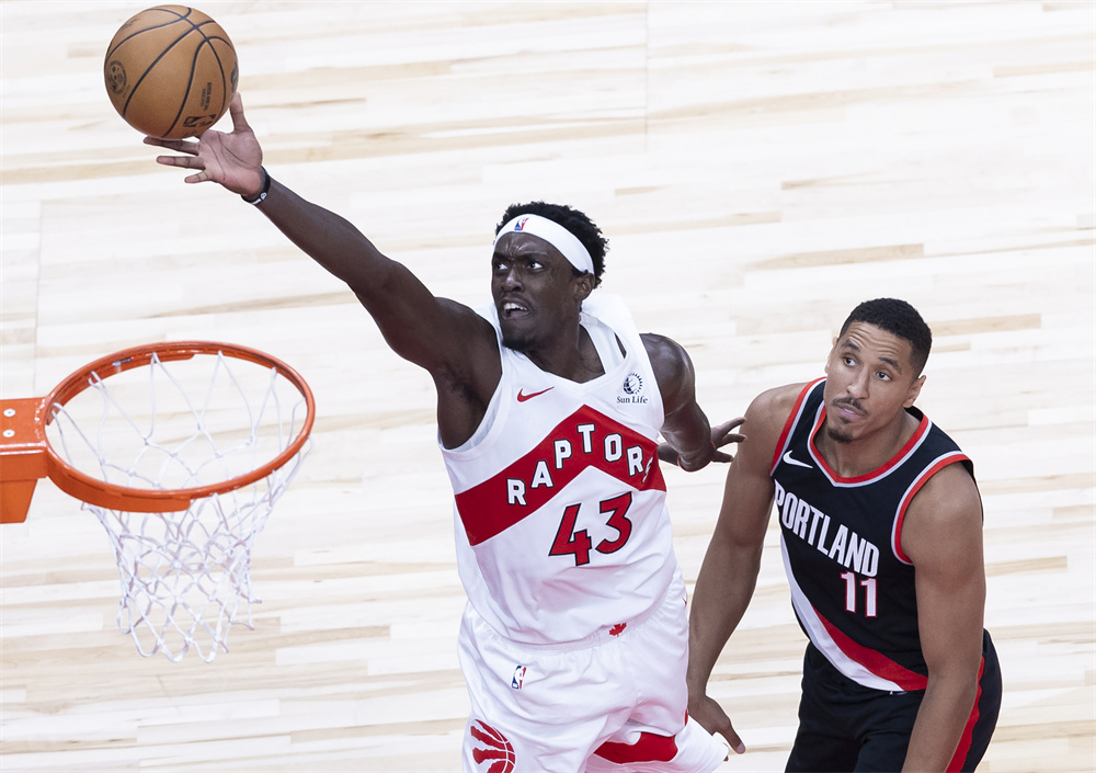 10月30日,猛龙队球员西亚卡姆(左)在比赛中上篮。当日,在2023~2024赛季NBA常规赛中,多伦多猛龙队主场以91比99负于波特兰开拓者队。