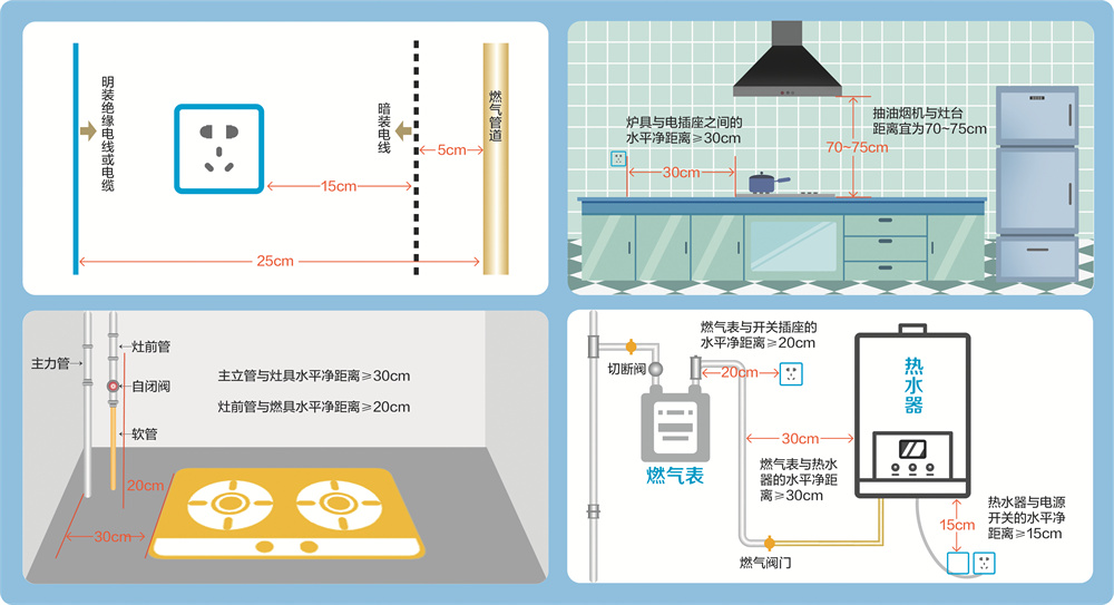 用户在进行水电管道改造时,燃气管道与暗装或套管内绝缘电线水平净距须保持在5cm以上,与明装的绝缘电线或电缆水行净距须保持在25cm以上,与电插座、电源开关水行净距须保持在15cm以上(图①)。