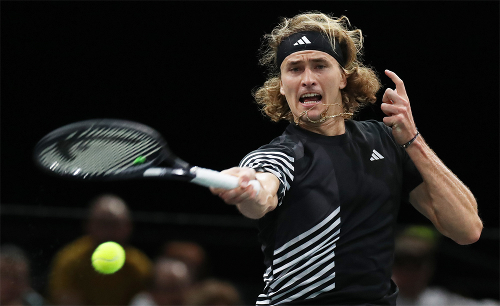 10月31日,兹韦列夫在比赛中回球。当日,在2023巴黎网球大师赛男子单打首轮比赛中,德国选手兹韦列夫以2比1战胜匈牙利选手富乔维奇,晋级下一轮。