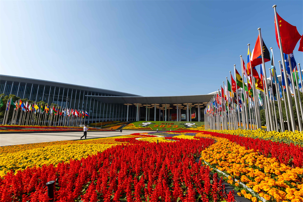 10月31日拍摄的国家会展中心(上海)南广场。第六届中国国际进口博览会即将在上海举行,国家会展中心(上海)装点一新,迎接八方客商。 新华社记者 王翔 摄