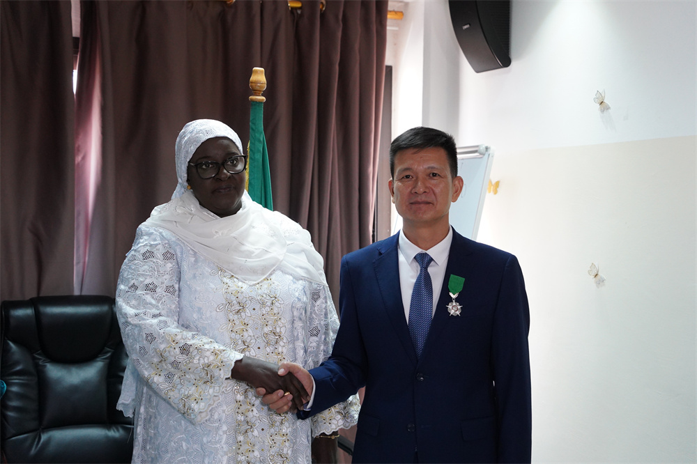 11月2日,在塞内加尔首都达喀尔,塞内加尔卫生和社会行动部长恩迪亚耶与中国第19批援塞医疗队队长吴启明握手。塞内加尔政府2日为中国第19批援塞医疗队全体队员颁发勋章和荣誉证书,以表彰他们为塞医疗卫生事业作出的卓越贡献。