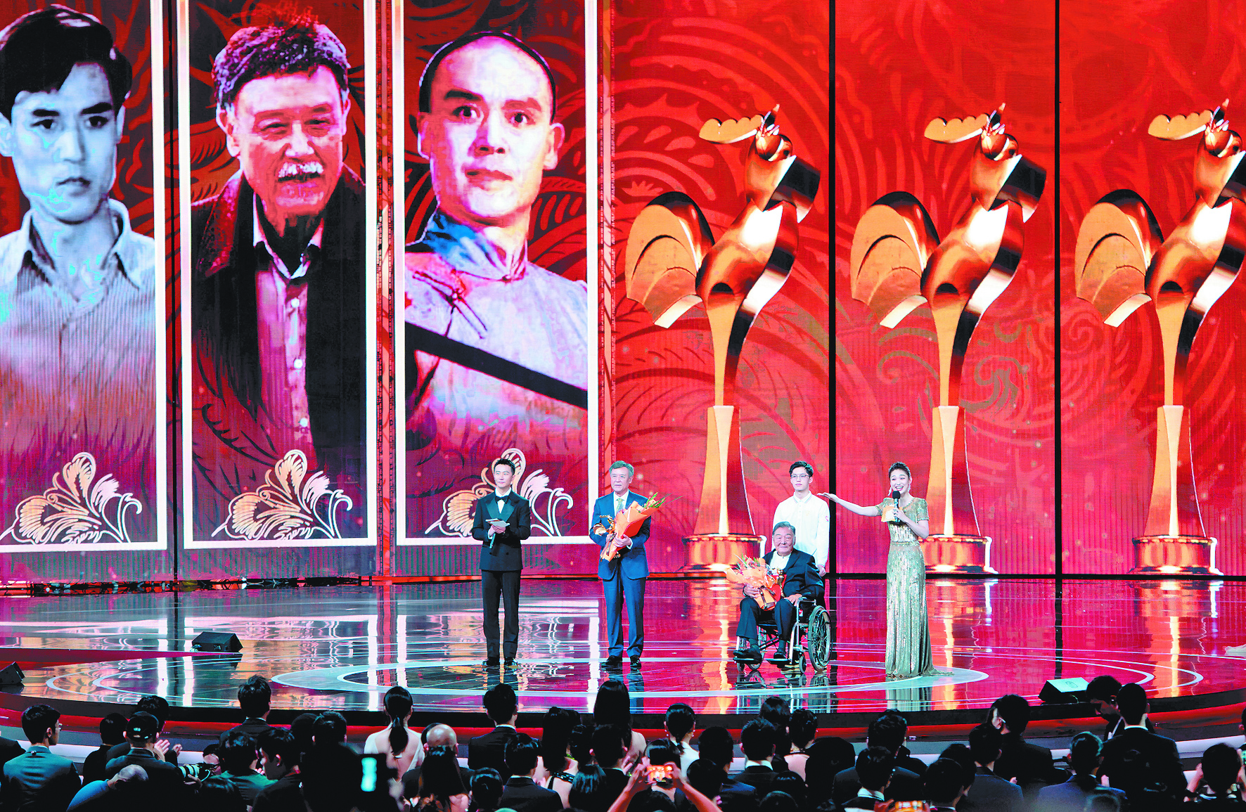 颁奖典礼上,达式常、翟俊杰获颁中国文联终身成就奖(电影)。 (新华社)