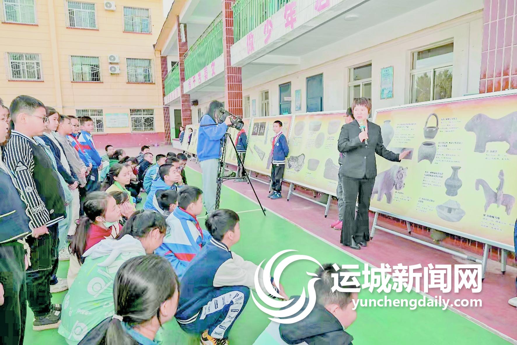 当天,在铝基地太华小学的操场上,河津市博物馆精心准备的文物展板整齐摆放。河津市博物馆讲解员以河津市独具特色的历史文物为主要内容,结合展板图片,带着学生们来了一段“穿越”之旅(上图)。在这段旅程当中,讲解员以通俗易懂的语言向学生们详细介绍了青铜器、瓷器、钱币等文物故事。一张张珍贵的图片资料、一份份翔实的资料,让这群孩子遨游在历史的海洋中,加深了对文物古迹的了解,增强了关注本土文化和保护文化遗产的意识。