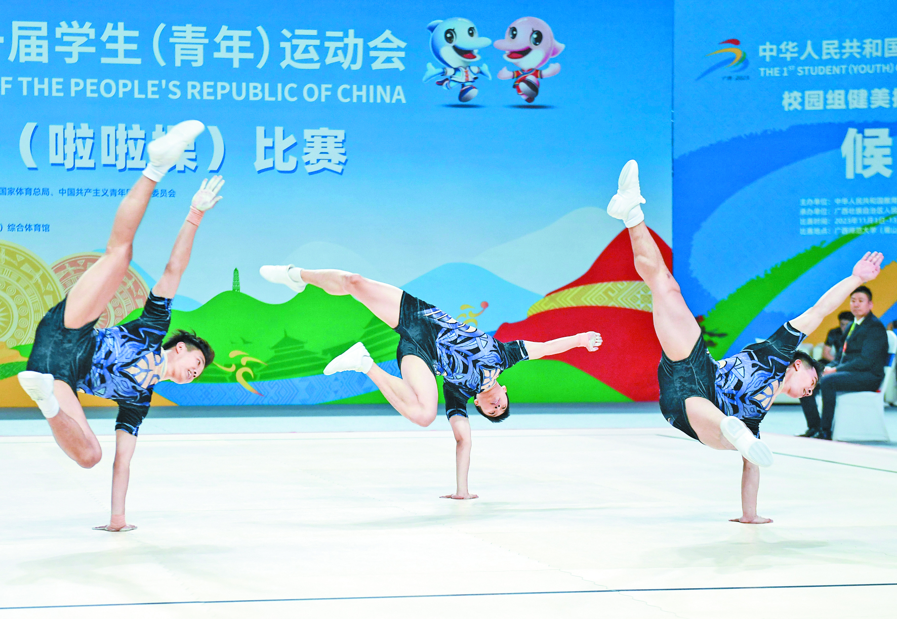 当日,第一届全国学生(青年)运动会健美操大学组三人操决赛在广西师范大学(雁山校区)综合体育馆举行。