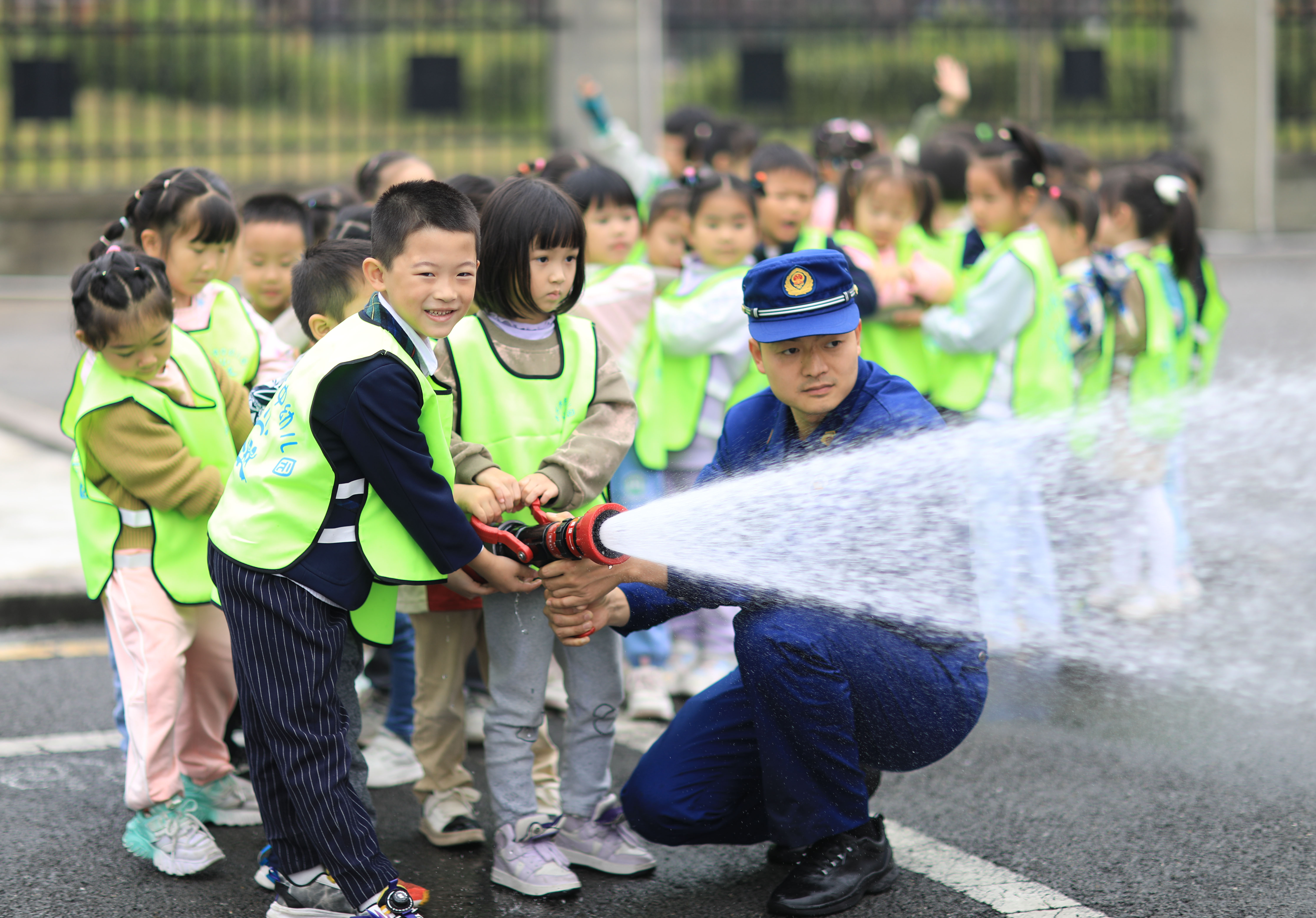 ▲11月8日,在贵州省赤水市消防救援大队,小朋友在消防救援队员的辅导下体验使用消防水枪。