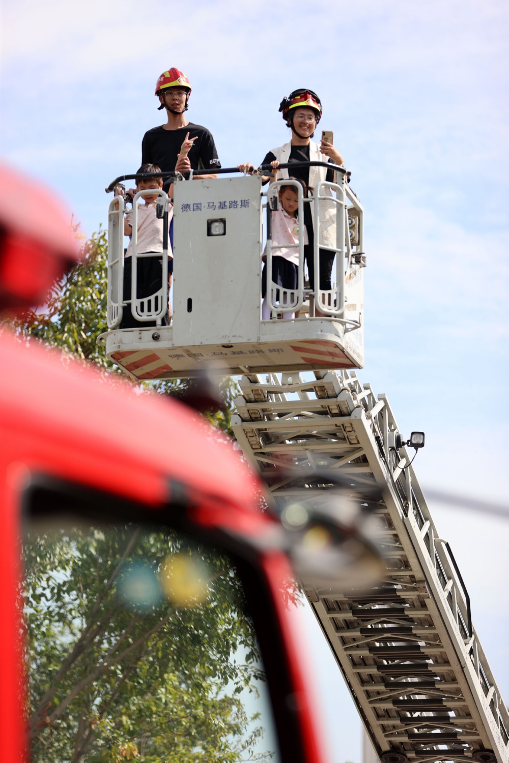 11月8日,在福建省厦门市翔安区消防宣传月启动仪式现场,小朋友和家长体验消防云梯车。