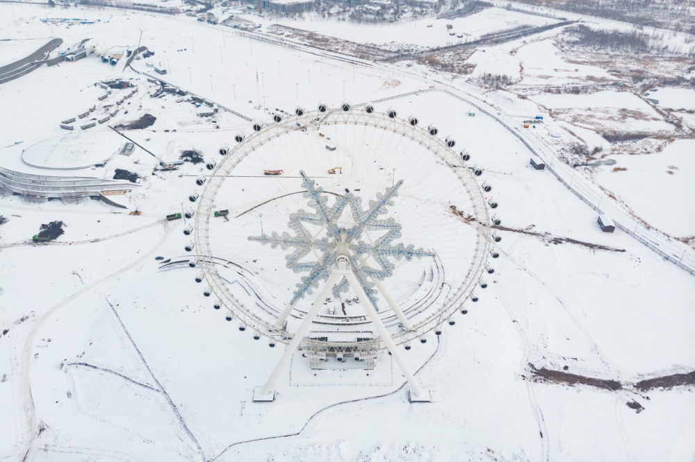 这是11月9日拍摄的位于哈尔滨冰雪大世界园区内的雪花摩天轮(无人机照片)。