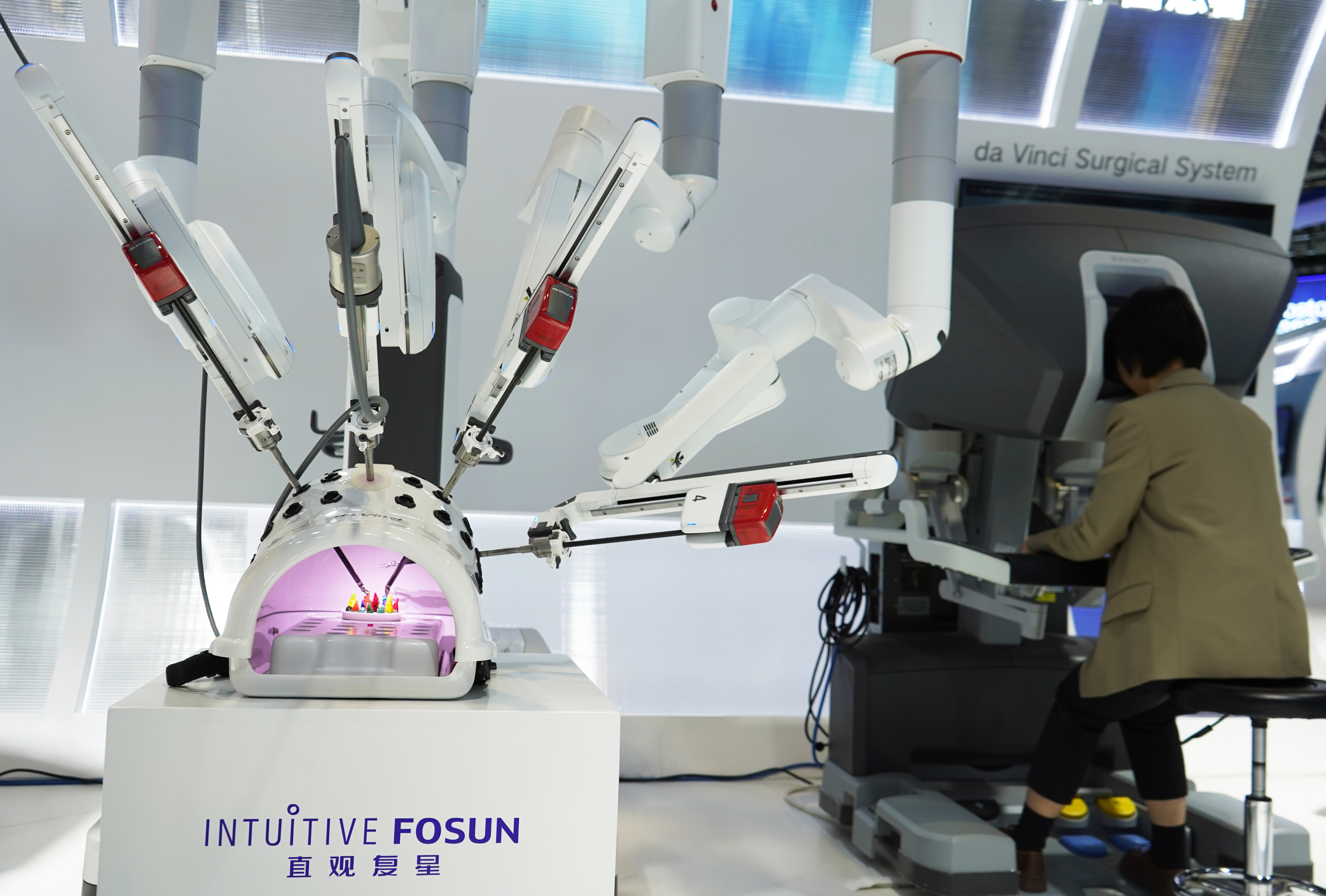 ▲11月7日,在第六届进博会医疗器械及医药保健展区复星健康展台,工作人员演示操作国产达芬奇手术机器人。