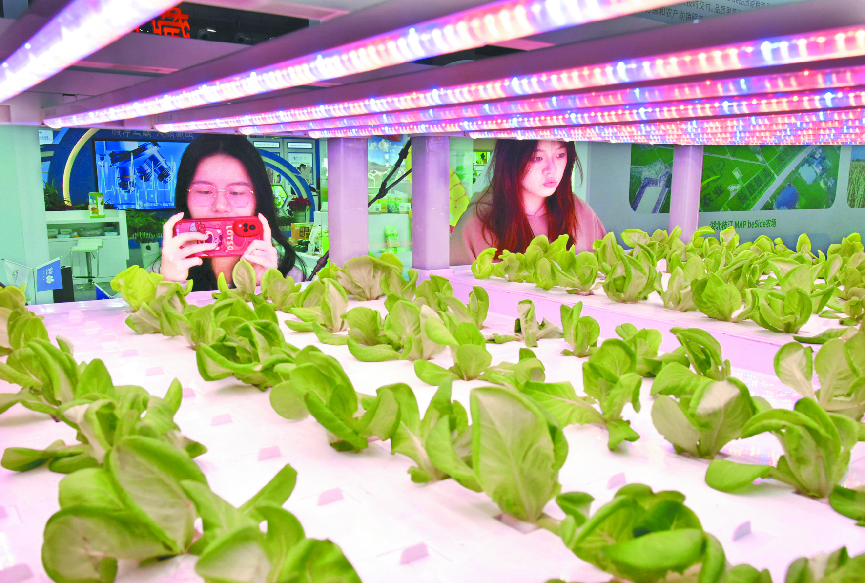 11月9日,观众在展会上拍摄“灯照蔬菜”。当日,第二十届中国国际农产品交易会在山东省青岛市开幕,近3000家企业携两万余种展品参展,吸引各地专业采购商逾3万人参加。本届农交会以“奋进新征程、强农促振兴”为主题,设置了粮油、果蔬、水产等11个展区,展览面积12万平方米。