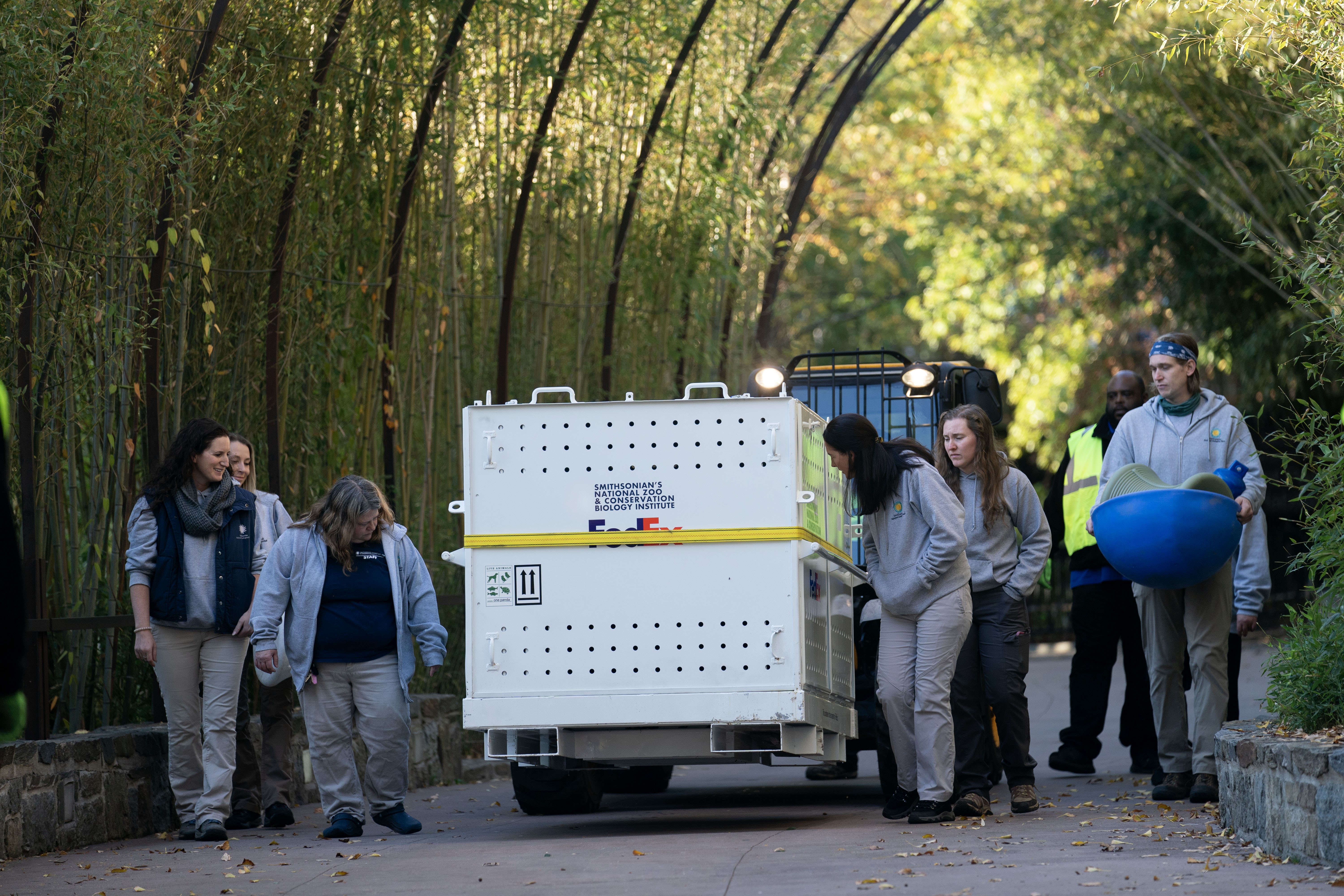11月8日,在美国华盛顿史密森学会国家动物园,装有大熊猫的箱子被准备运往机场。