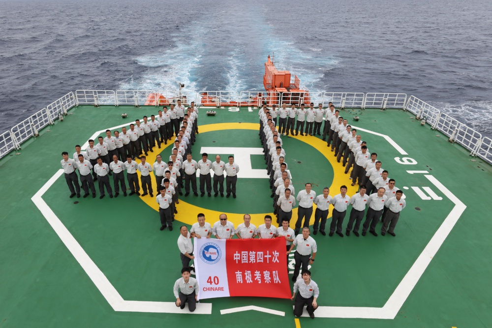 11月10日,中国第40次南极考察队在“雪龙2”号上排列成“40”字样的队形合影留念。北京时间11月9日22时,正在执行中国第40次南极考察任务的“雪龙2”号穿越赤道进入南半球。此前,“雪龙”号和“天惠”轮货船分别于8日、9日驶过赤道。至此,中国第40次南极考察队3艘船全部进入南半球。