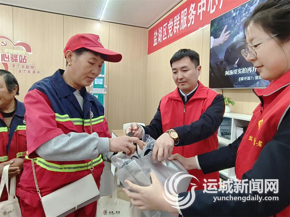 “无论严寒酷暑,咱们环卫工人都始终坚守在一线,守护着城市的环境,不间断服务社会。大家尽管来驿站休息、喝水,我们会为大家服务好,最大限度地满足户外劳动者的日常需求。”盐湖区党群服务中心户外劳动者爱心驿站工作人员边给大家发放大礼包边说。