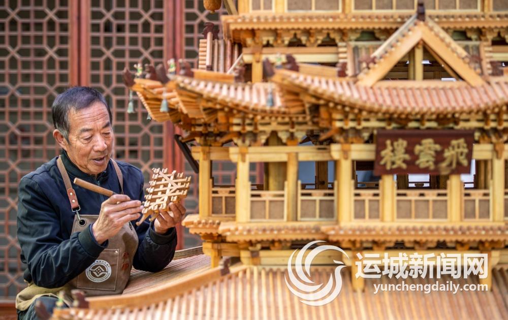 今年62岁的许水山,是万荣县南张乡东苏冯村的一位农民工匠。他秉承古法、锐意创新、匠心独运,历时两年多,采用中国传统的榫卯工艺,用5方木料,10万多个结构部件,345组斗拱,按照10比1的比例,将中华第一木楼——万荣飞云楼微缩成一个高2.319米、宽1.78米的飞云楼模型作品。该作品不仅传承了非遗文化,也极具观赏性和收藏价值。 记者 薛俊 摄