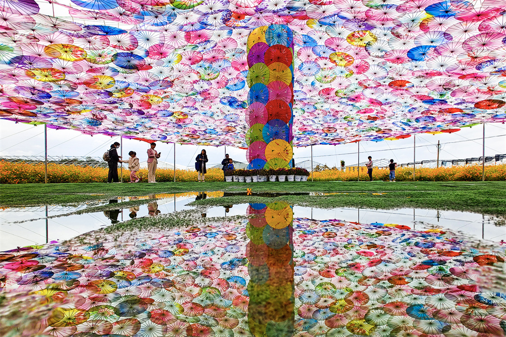11月11日,游客在浙江省宁波市宁海县力洋镇海头村的伞棚下游玩赏花。