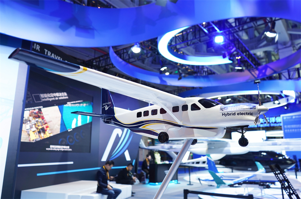11月10日在第六届进博会汽车展区拍摄的安飞九座混动飞机模型。 新华社记者 金皓原 摄