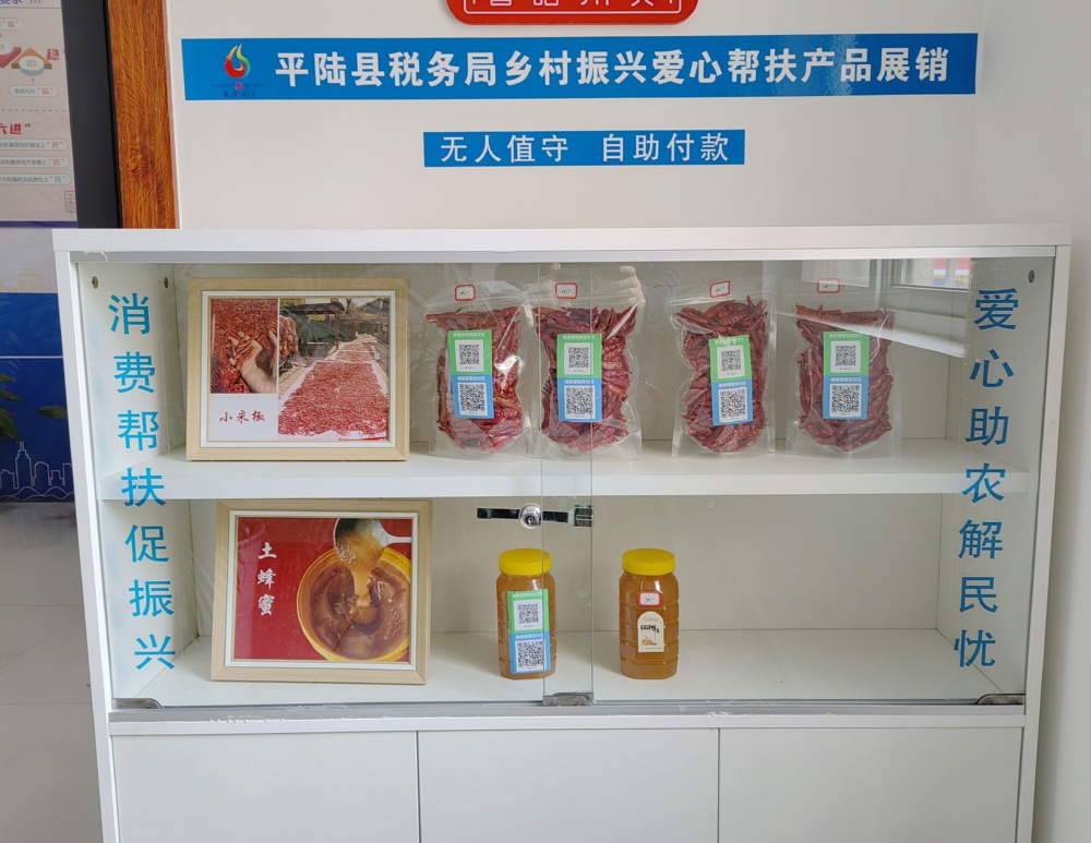 近日,在国家税务总局平陆县税务局,一个爱心消费专柜出现在税务干部面前。该展销柜由专人负责管理,里面摆放着该局所驻帮扶村生产的农产品,主要以小米椒、土蜂蜜为主,干部职工按标价扫描二维码付款后,可自行提取所购产品。此举既为消费帮扶打造了便捷途径,又彰显了税务干部的爱心。