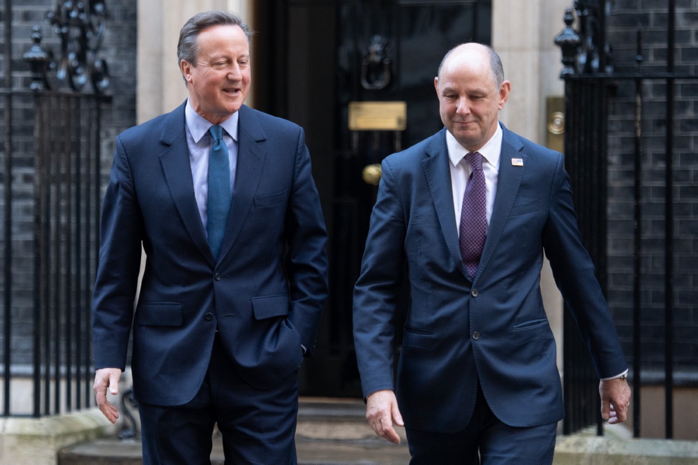 11月13日,在英国伦敦,新任外交大臣戴维·卡梅伦(左)走出唐宁街10号首相府。