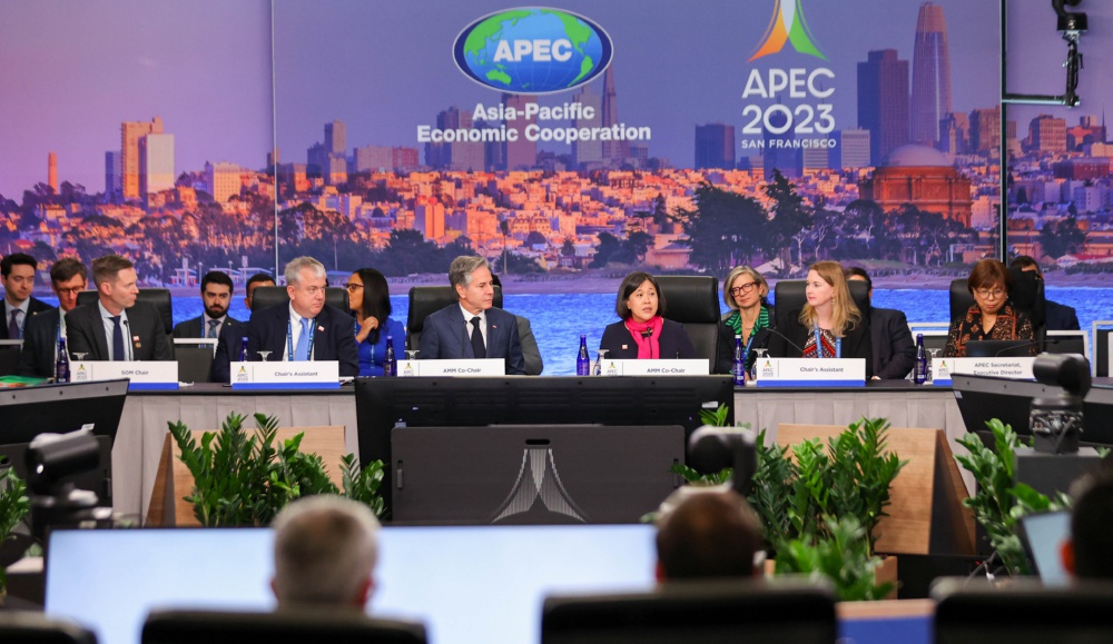 11月14日,美国国务卿布林肯(中左)和贸易代表戴琪(中右)共同主持在旧金山举行的亚太经合组织部长级会议。亚太经合组织部长级会议14日在美国旧金山开幕。会议为期两天,与会者主要讨论实现可持续发展的新措施。