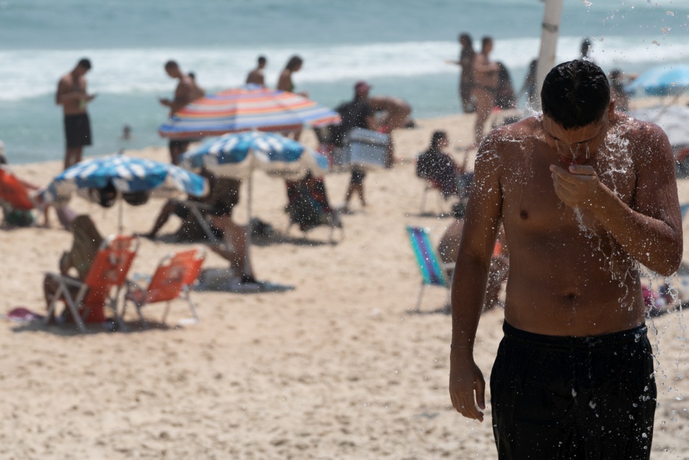 11月14日,一名男子在巴西里约热内卢依帕内玛海滩上冲凉。近日,巴西多地经历热浪袭击。巴西国家气象研究所已将15个州和联邦区列入气温高于平均水平的“危险”警报中。据预测,接下来几天,部分地区气温将超40℃。