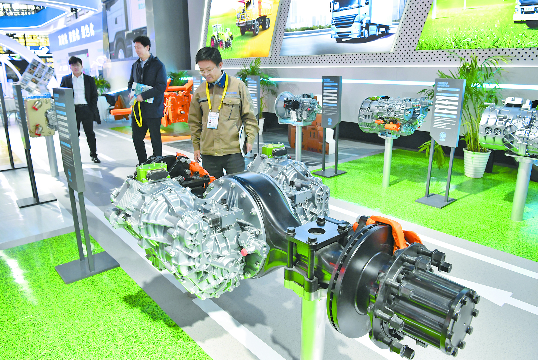 11月16日,观众在第七届丝博会上参观一款电驱桥总成。新华社记者 邵 瑞 摄