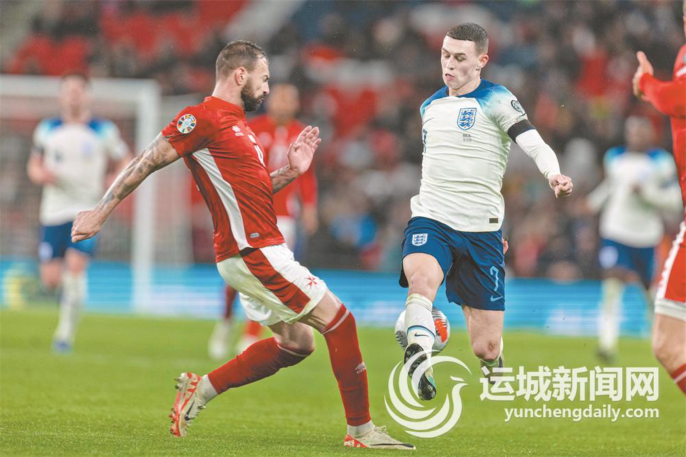 11月17日,英格兰队球员福登(右)与马耳他队球员拼抢。