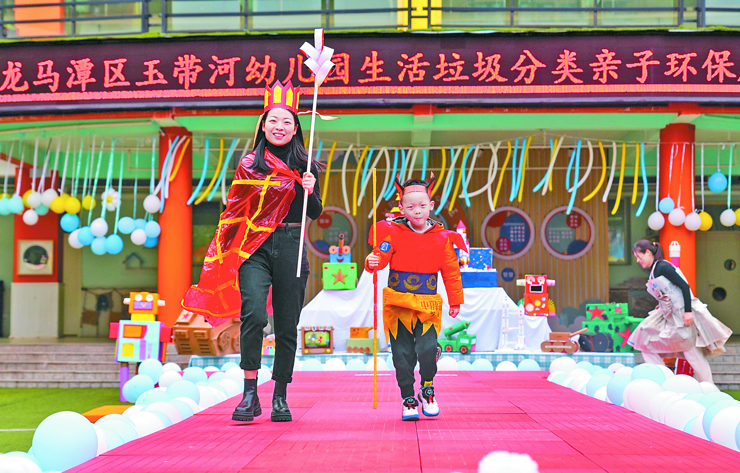 当日,玉带河幼儿园举办了一场垃圾分类亲子时装秀,小朋友和家长身着用废纸壳、塑料袋、旧报纸等材料制作的各类创意服装走上舞台进行展示,让低碳生活、变废为宝的理念深入幼儿心灵。 新华社发(杨尚威 摄)