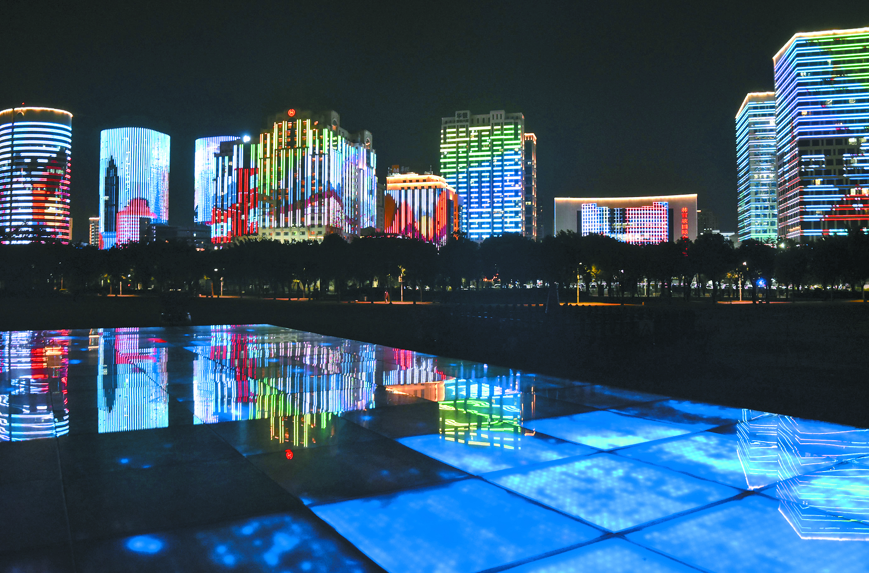 11月20日晚拍摄的广东汕头时代广场世界儿童日灯光秀城市夜景。