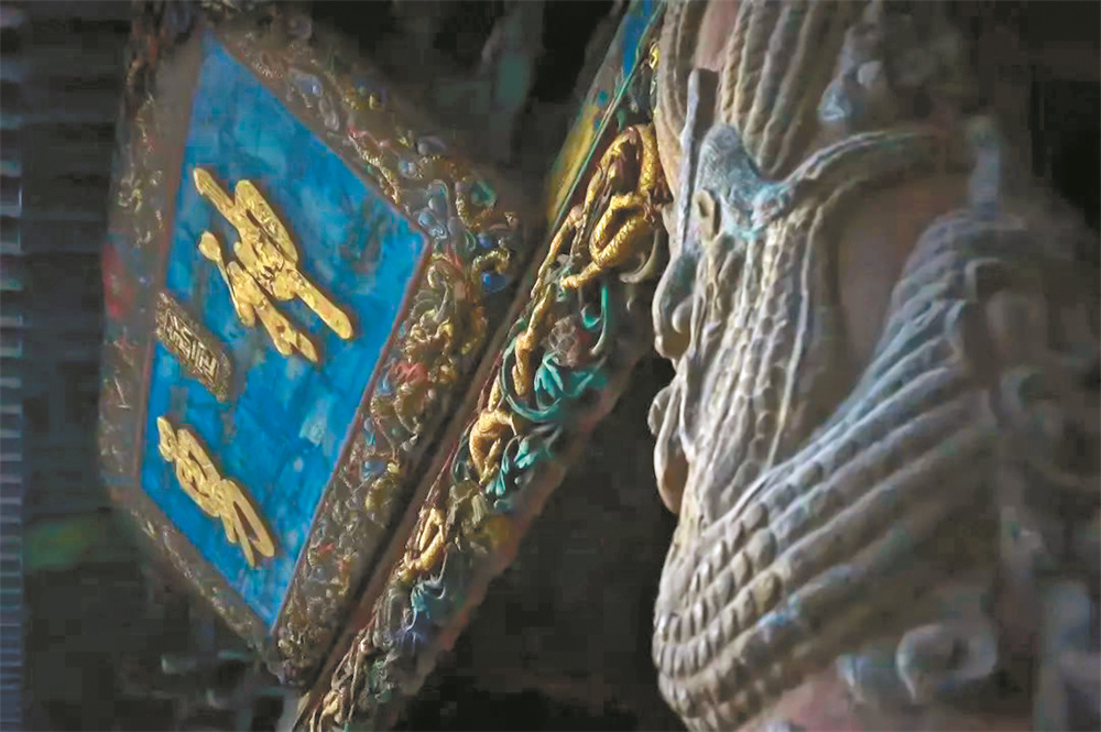 因此,有血有肉的关羽逝去了,人们就依照其生前的模样,用木胎泥质塑出他的威严,贴上金箔,并为他穿戴衮冕,让他手拿玉笏,将他抬至九五之尊的地位,受万人景仰。这些楹联匾额上的赞语也像那一笔一笔贴在塑像上的金子,今日你一片,明日他一块,日积月累,岁岁年年。终于在某一个时刻,他成了人们心中的“神”。