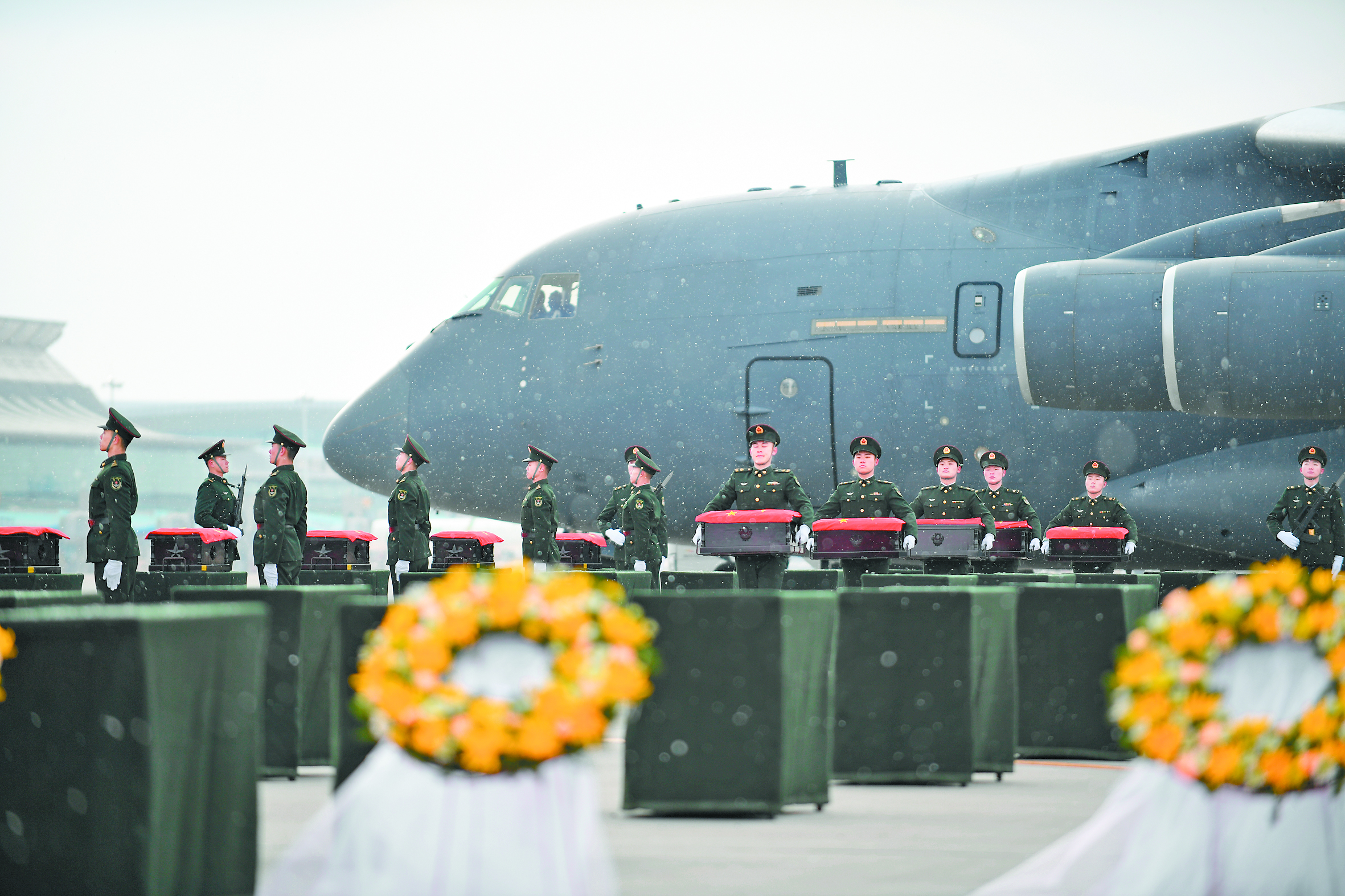 11月23日,在沈阳桃仙国际机场,礼兵将殓放志愿军烈士遗骸的棺椁从专机上护送至棺椁摆放区。