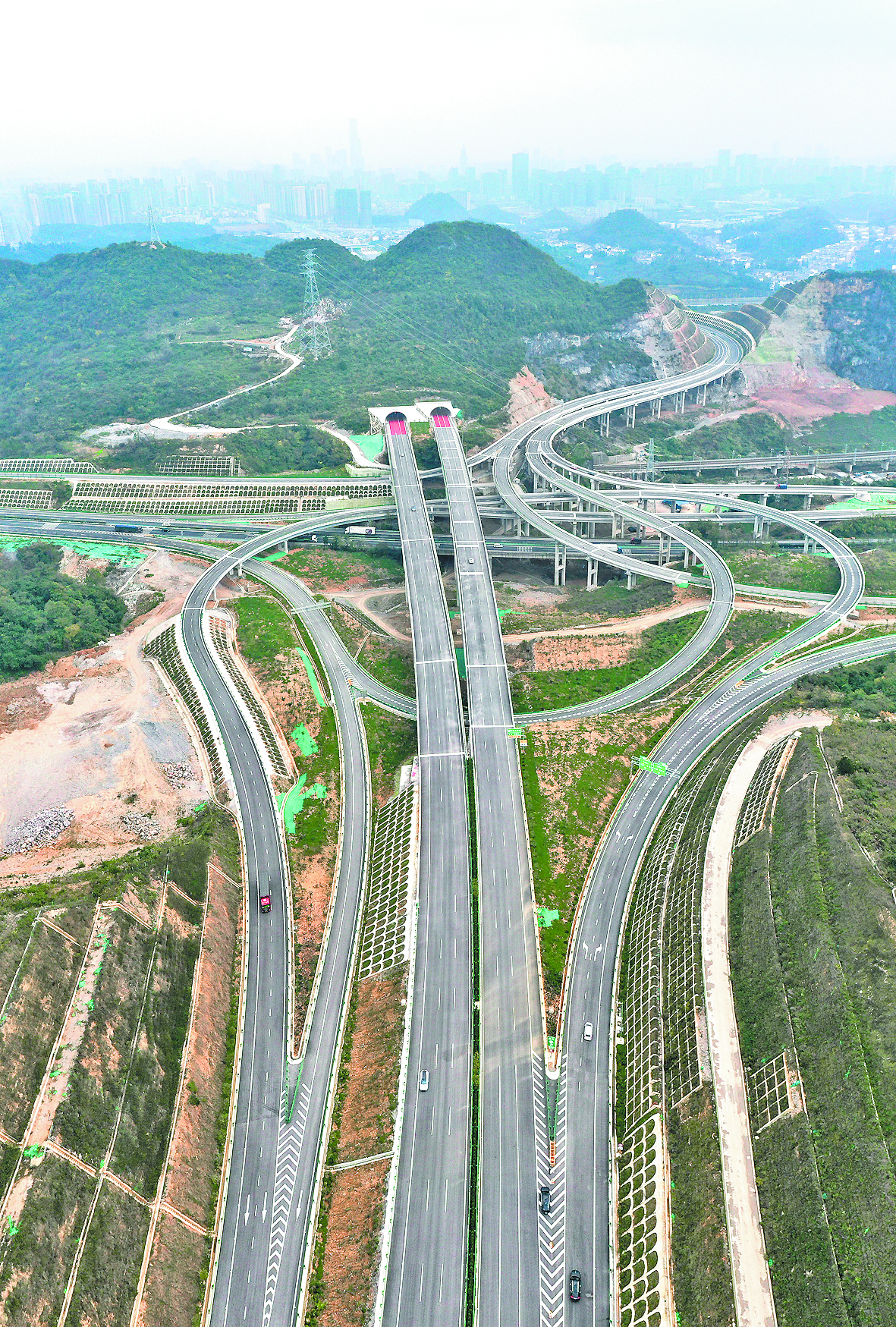 11月24日,车辆在贵金高速公路窦官枢纽互通上行驶(无人机照片)。