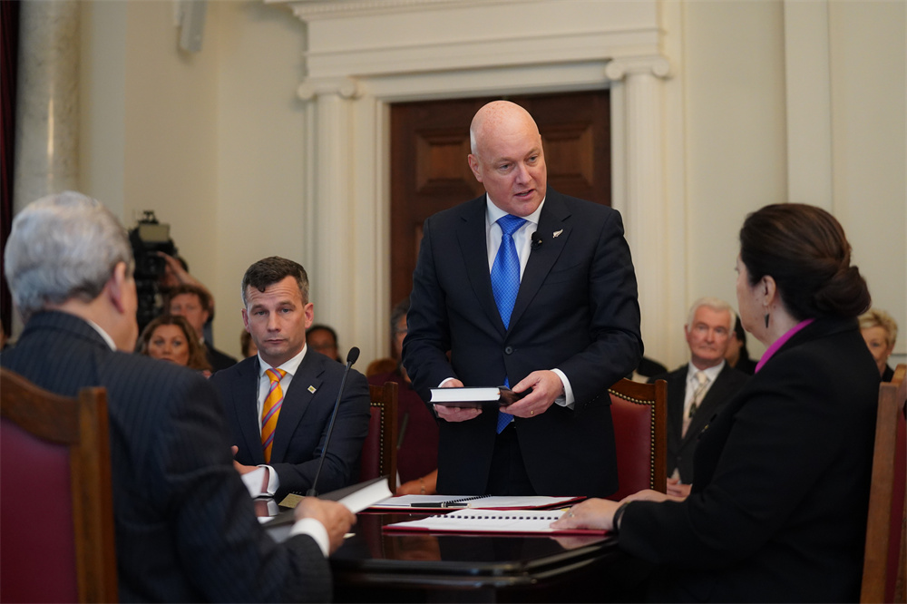 11月27日,在新西兰首都惠灵顿,国家党领导人克里斯托弗·拉克森(中)参加宣誓就职仪式。拉克森当日宣誓就职新西兰总理。 新华社发