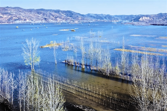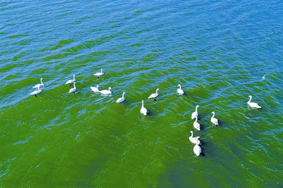11月23日,卢氏县范里镇范蠡湖波光潋滟,岸边柳条依依,白天鹅、白骨顶鸡等众多鸟类在湖边嬉戏觅食,构成了一幅人与自然和谐共生的美丽画卷。