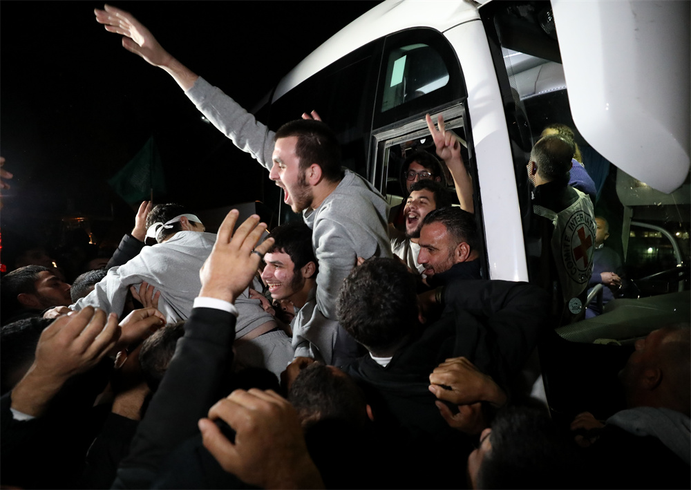 11月28日,在约旦河西岸城市拉姆安拉,人们庆祝被关押的巴勒斯坦人获释。
