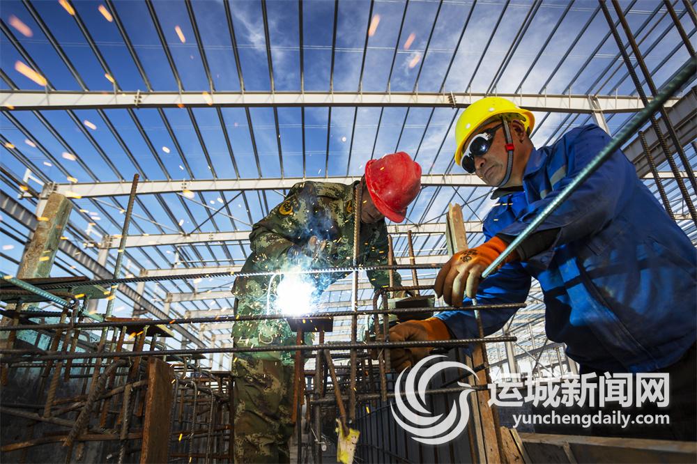 11月29日,在垣曲县经济技术开发区华兆住工ALC装配式建筑新材料项目建设工地上,工人正加紧施工。