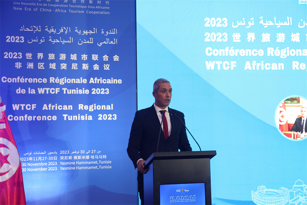 11月29日,在突尼斯东部海滨城市哈马马特,突尼斯旅游部长贝勒哈桑在2023世界旅游城市联合会非洲区域会议上讲话。2023世界旅游城市联合会非洲区域会议当日在哈马马特举行,会议以“中国-非洲旅游合作新时代”为主题,旨在推动中非旅游协作发展,推进中国和非洲旅游企业交往与合作。