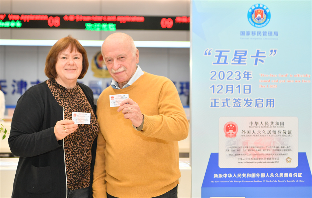 12月1日,外籍人士在天津市公安局出入境管理局展示新领取的“五星卡”。 新华社记者 孙凡越 摄
