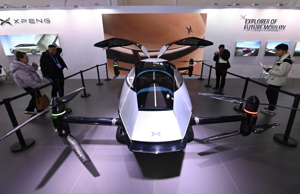 12月1日,在链博会智能汽车链展区小鹏汽车展台,参观者观看一台智能飞行器。