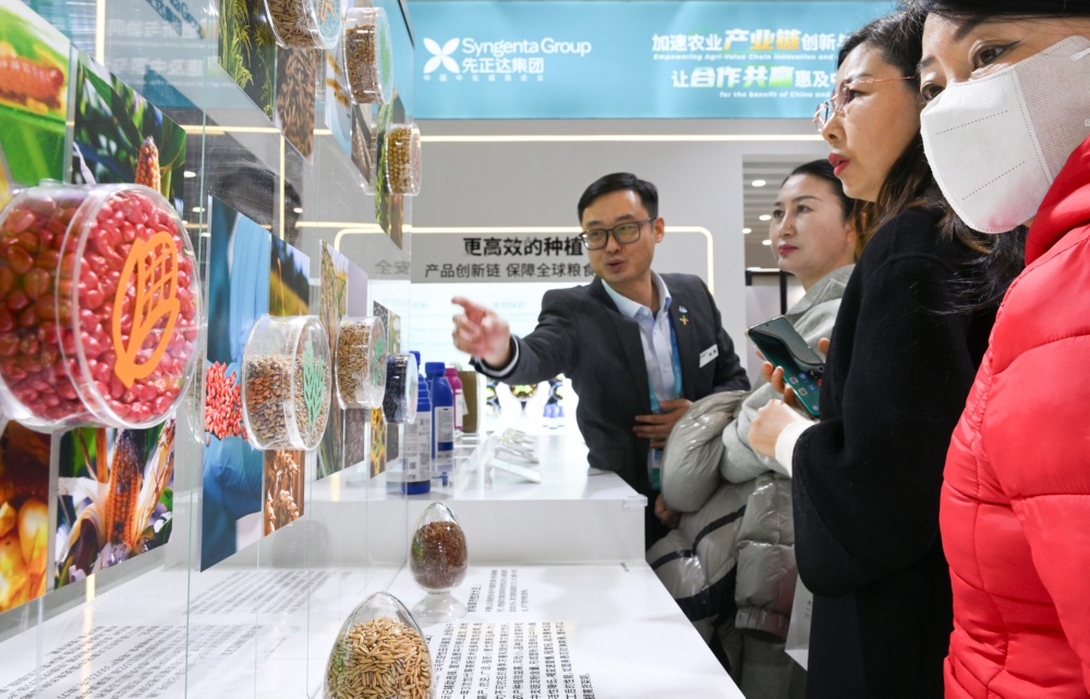 11月30日,在链博会绿色农业链展区,参观者在先正达集团展台前向工作人员了解种子研发情况。 新华社记者 李 贺 摄