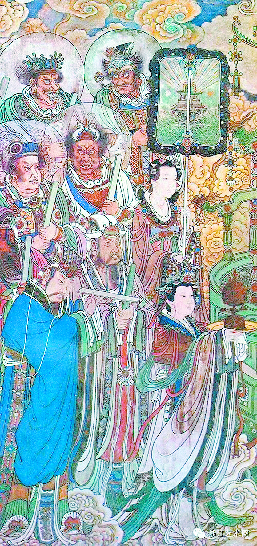 著名美术史家、美术教育家金维诺曾撰文指出,宋代画家武宗元也曾在老君庙重画《五圣朝元图》,之后还相继出现过类似的图像,如《朝真图》《朝会图》等。南宋《上清灵宝大法》上,保存了神祇系统的三百六十分位名目,主要包括三清、六天帝君及二帝后、三十天帝等,这一系统成为以后制作壁画及水陆画的主要依据。