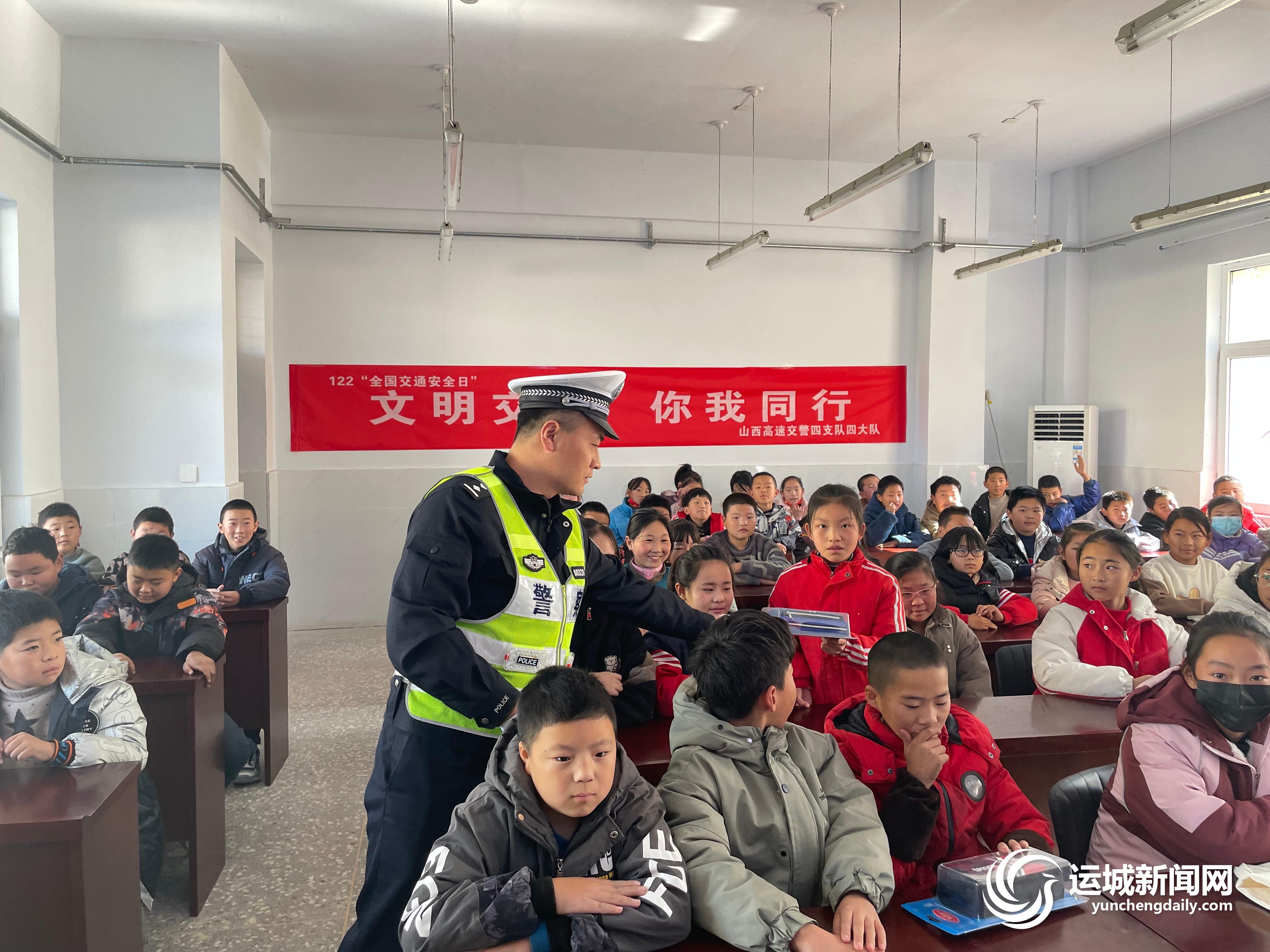 运城晚报讯 今年12月2日是第十二个“全国交通安全日”。为进一步提升辖区沿线学校师生“知危险 会避险”的能力,增强学生的安全意识,12月1日,山西高速交警四支队四大队走进永济市卿头小学,开展122“全国交通安全日”主题宣传活动。