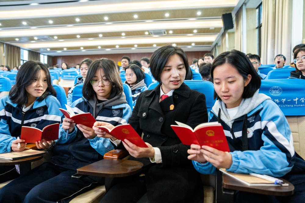 12月4日,在浏阳市第一中学,法院工作人员(右二)给学生讲解宪法。